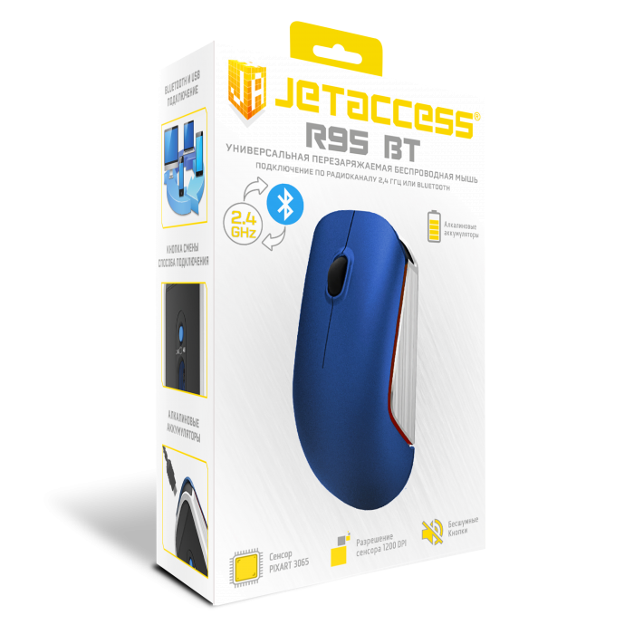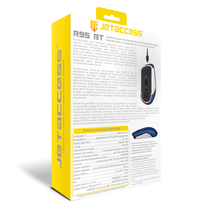 Использование двух технологий подключения делает мышь R95 BT поистине универсальным девайсом. Модель можно использовать с персональным компьютером или ноутбуком, просто подключив радиопередатчик в слот USB. А технология Bluetooth позволяет подключить мышь к ультрабукам, у которых отсутствуют порты USB. Кроме того, канал Bluetooth дает возможность использования мыши с любыми устройствами на платформе Android и IOS. В этом случае на экране устройства появляется привычный курсор, действия которого аналогичны действиям при управлении касанием пальца.
