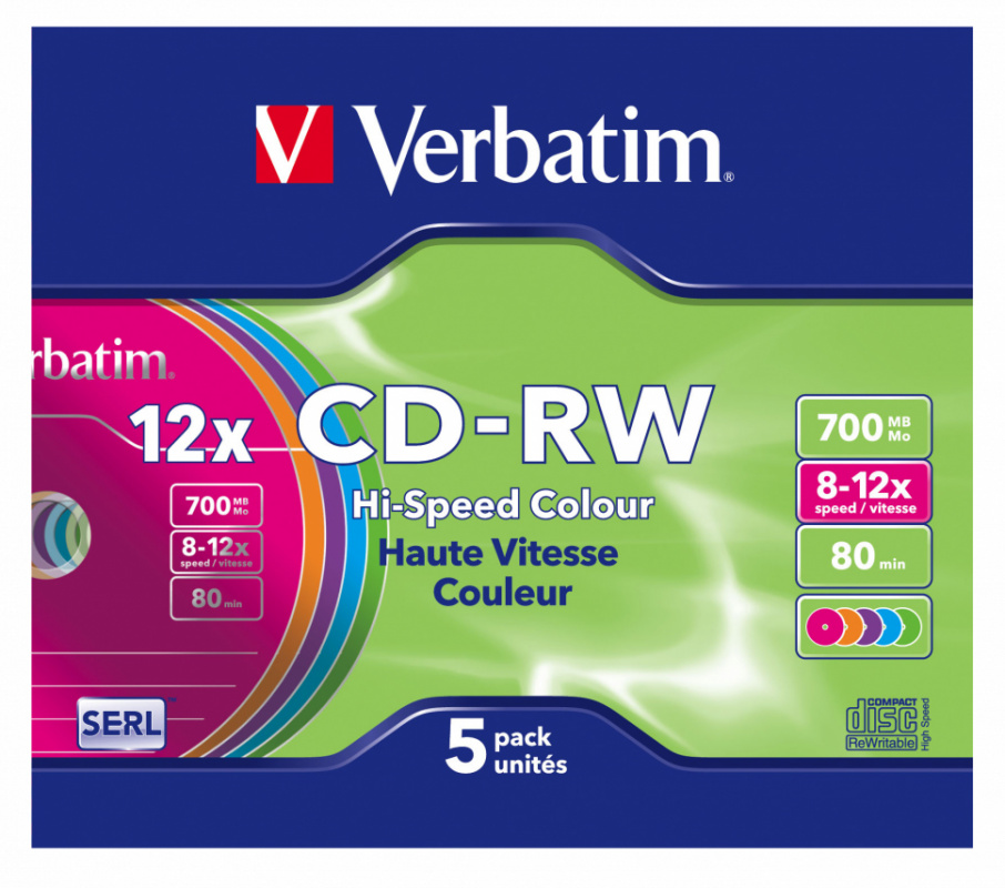 Диск CD-RW Verbatim 700Mb 12x Slim case (5шт) Color (43167)