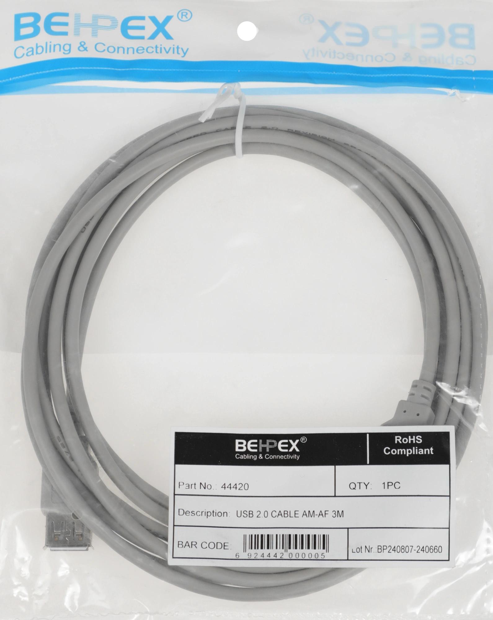 Стандартный кабель-удлинитель для устройств USB 2.0. Может быть использован для увеличения длины кабелей клавиатуры, мыши, Web-камеры, картридера и прочих устройств. Длина 3 метра.