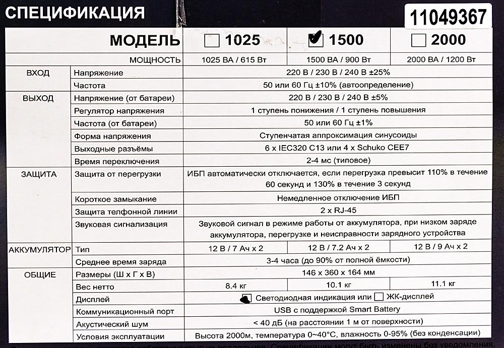 защита сети (порт RJ-45), защита телефона (порт RJ-11), от глубокого разряда батареи, от короткого замыкания, от перегрузки