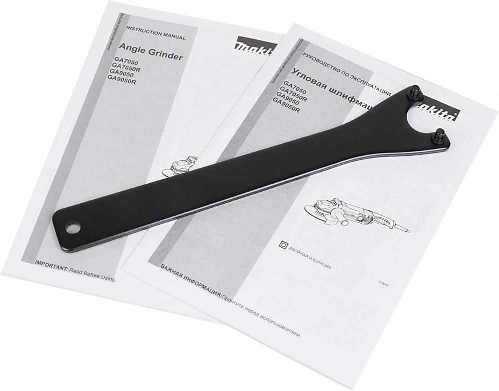Угловая шлифмашина, дополнительная рукоятка, ключ, упаковка.
