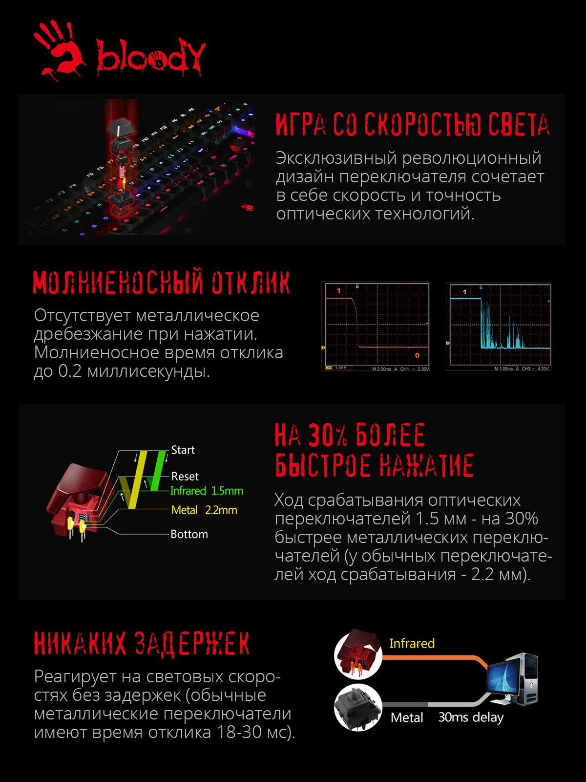 тип клавиш – мембранные (частично механика), 8 игровых клавиш, время отклика – 0.2 мс., усиленный пробел, прорезиненные ножки. Технология: Light Strike. Оптические переключатели: QWER/ASDF.