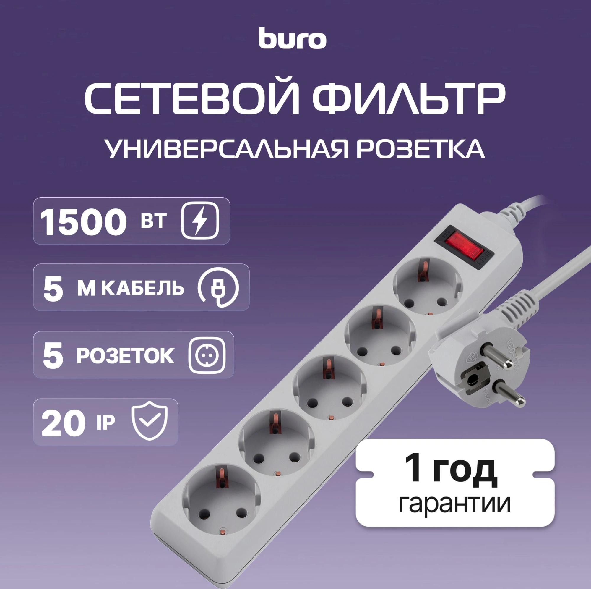 Сетевой фильтр Buro 500SL-5-G 5м (5 розеток) серый (пакет ПЭ)