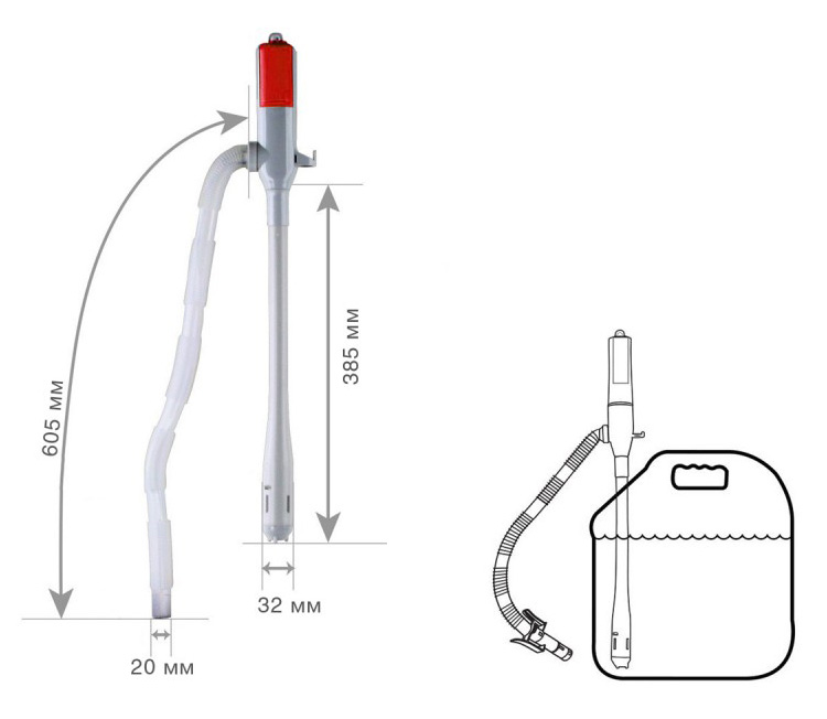 Тип жидкости: бензин, дизельное топливо, керосин, легкие масла, спирты, тех. вода. Питание: батарейки типа АА 1, 5V x 2 шт. Производительность: 10 л/мин. Объём перекачиваемой жидкости: до 600 литров (от 2-х батареек типа АА). Диаметр трубки: 32 мм. Длина трубки: 385 мм. Длина шланга: 605 мм.