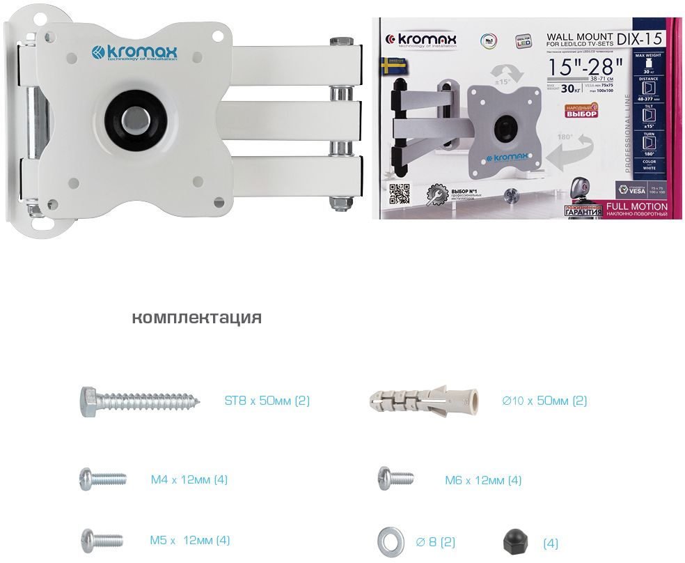 Кронштейн для телевизора Kromax DIX-15W белый 15"-28" макс.30кг настенный поворот и наклон