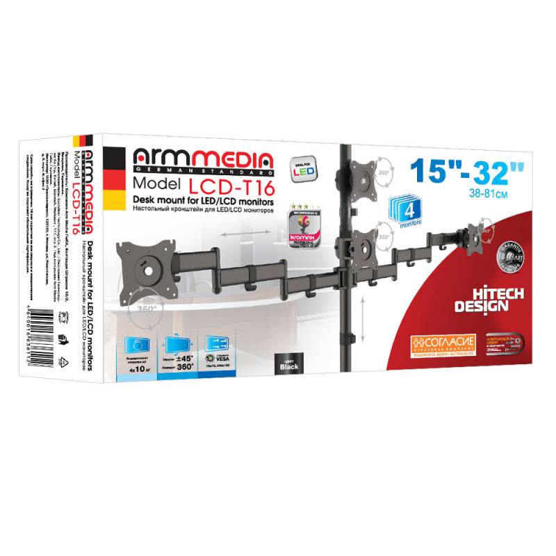 Универсальное настольное крепление с горизонтальным размещением 4 мониторов. Два варианта установки на столешницу: за край стола и на поверхность стола. Кабель-каналы.