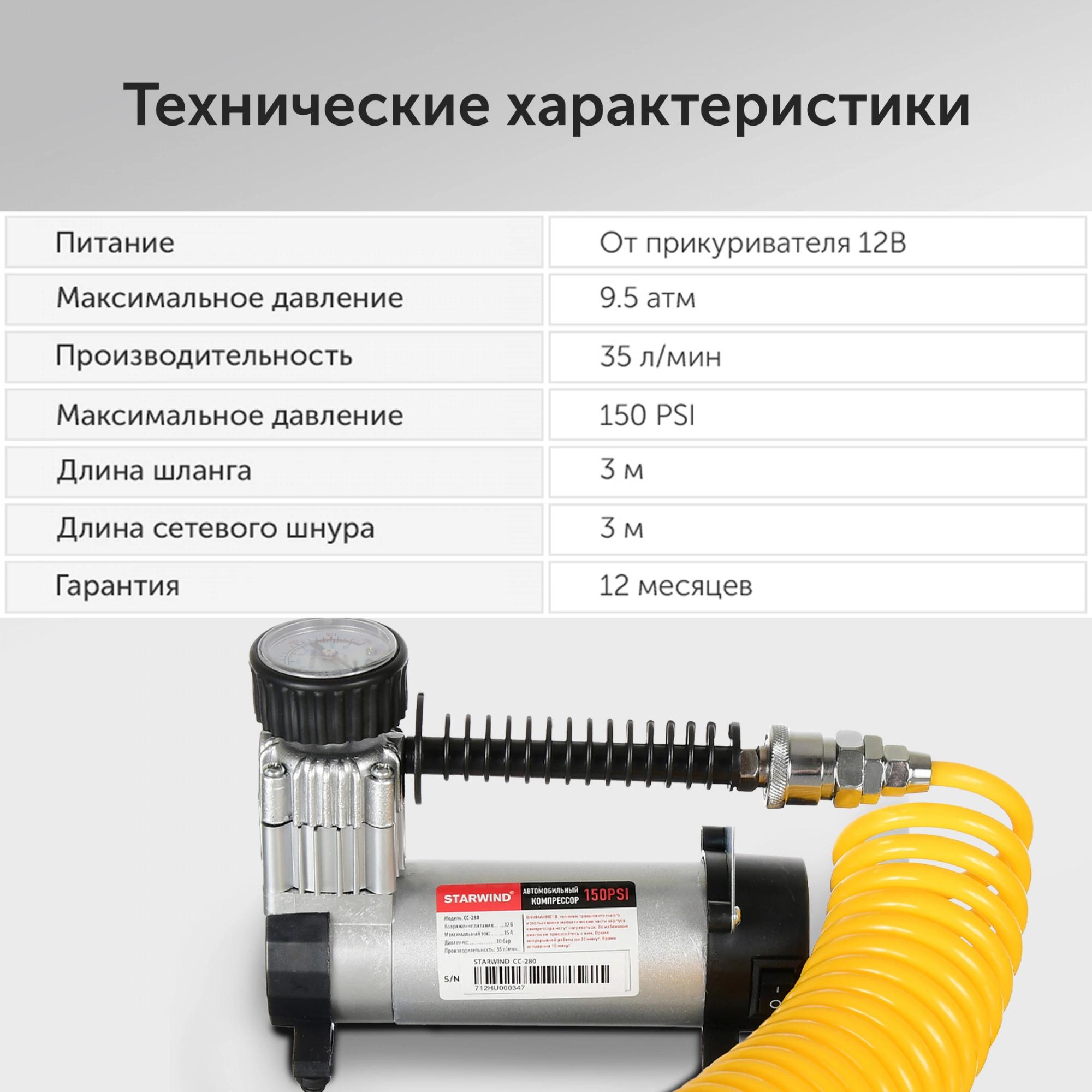 Автомобильный компрессор Starwind CC-280 35л/мин шланг 3м