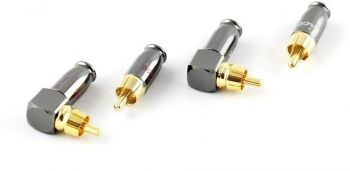 Комплект из 2-х прямых и 2-х угловых металлических RCA коннекторов в упаковке, наконечники с никилерованным покрытием, диаметр под RCA кабель до 9мм