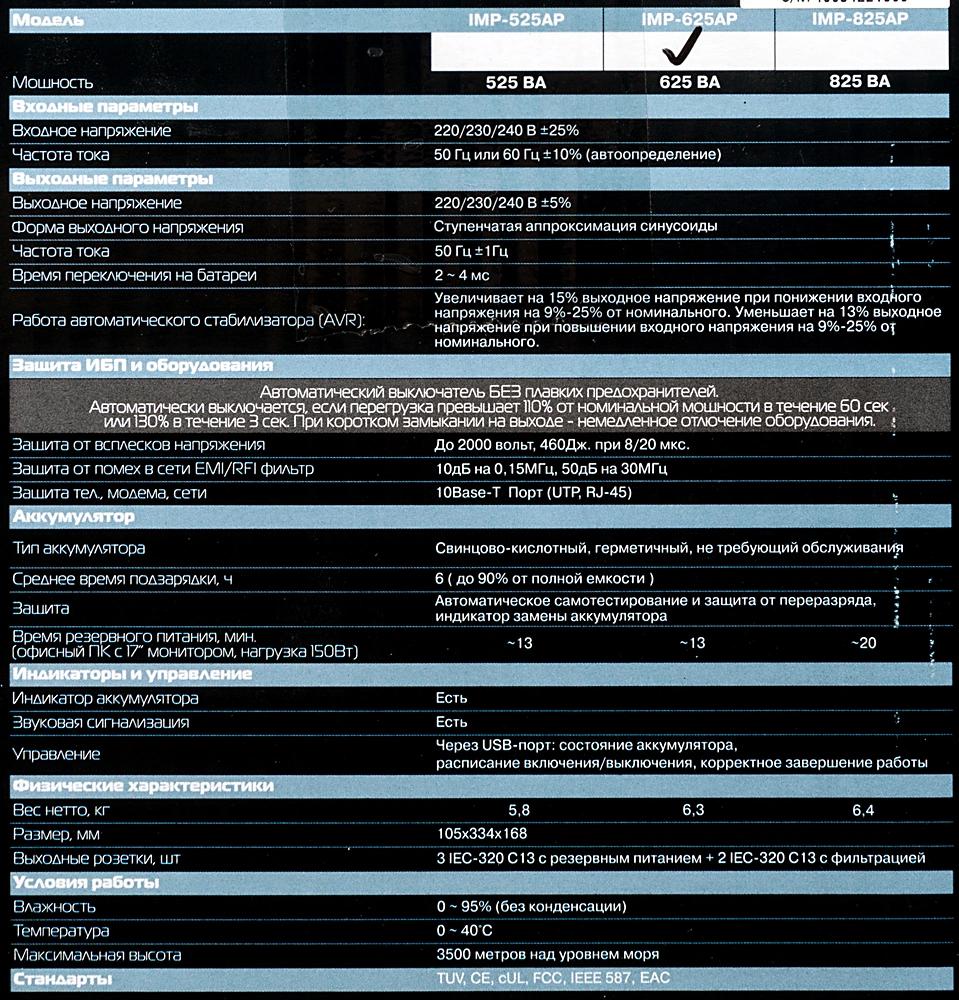 защита коаксиальных линий (ТВ/кабельные модемы), защита сети (порт RJ-45), защита телефона (порт RJ-11), от глубокого разряда батареи, от короткого замыкания, от перегрузки