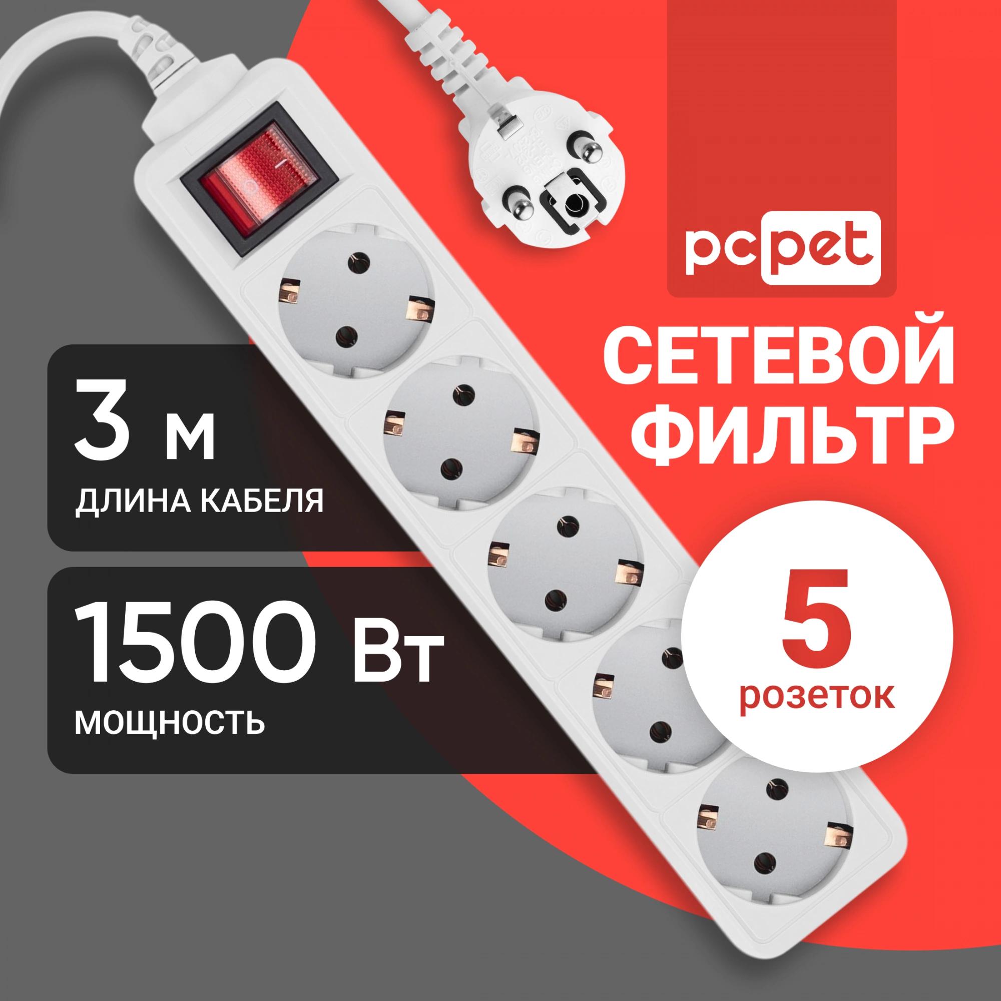Сетевой фильтр PC Pet AP01006-3-G 3м (5 розеток) серый (пакет ПЭ)