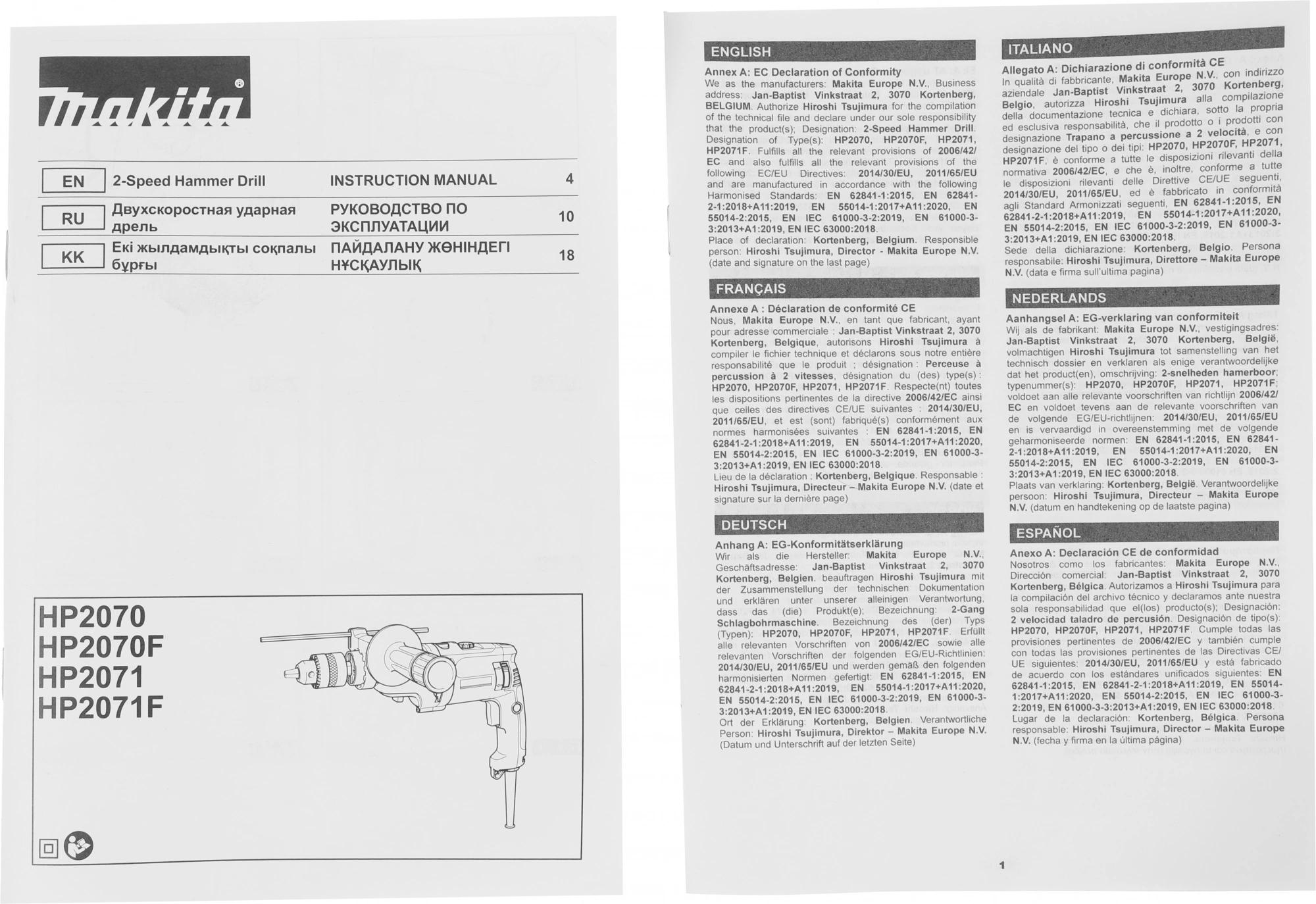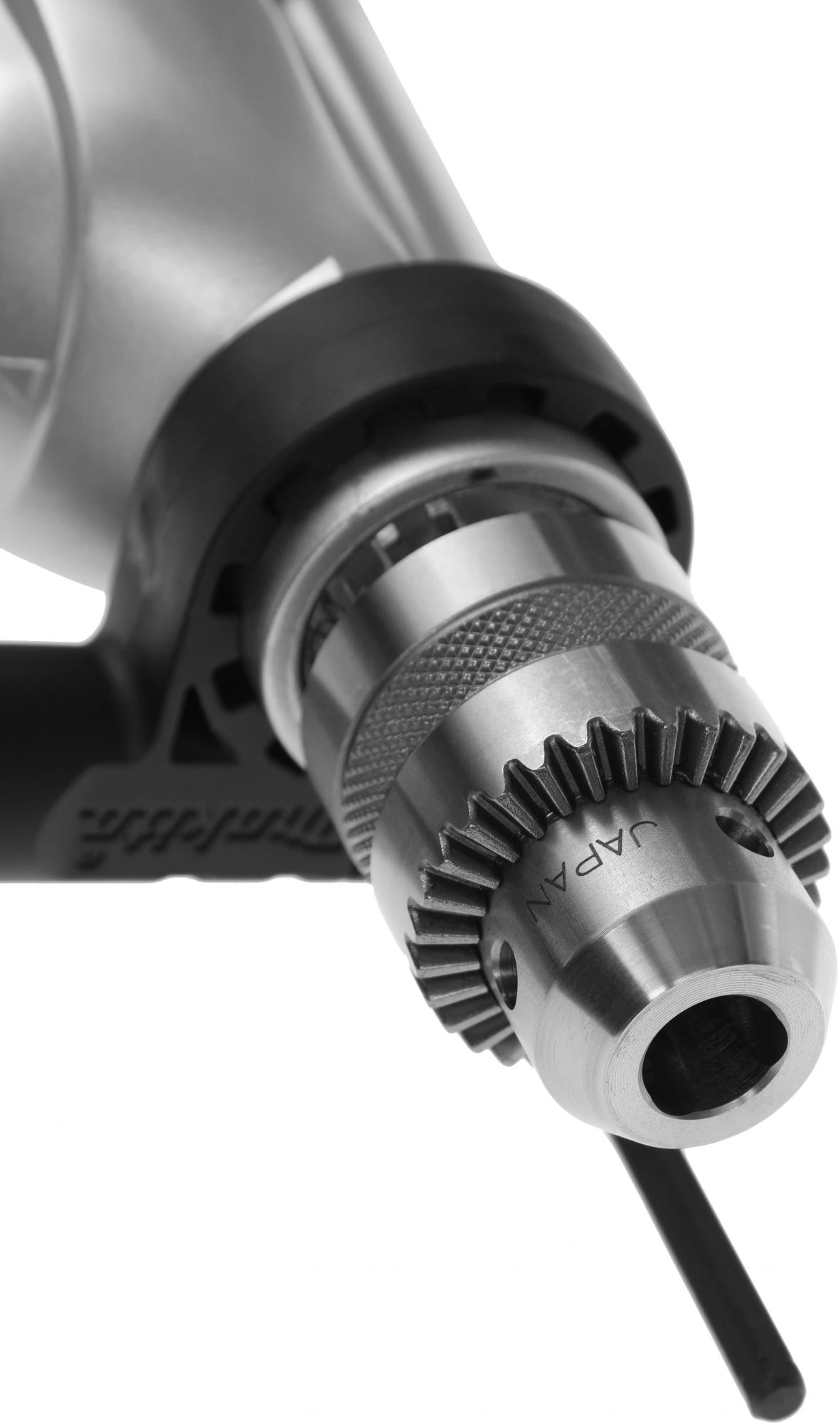 Дрель ударная, дополнительная рукоятка; ограничитель глубины; ключ для патрона; чемодан.