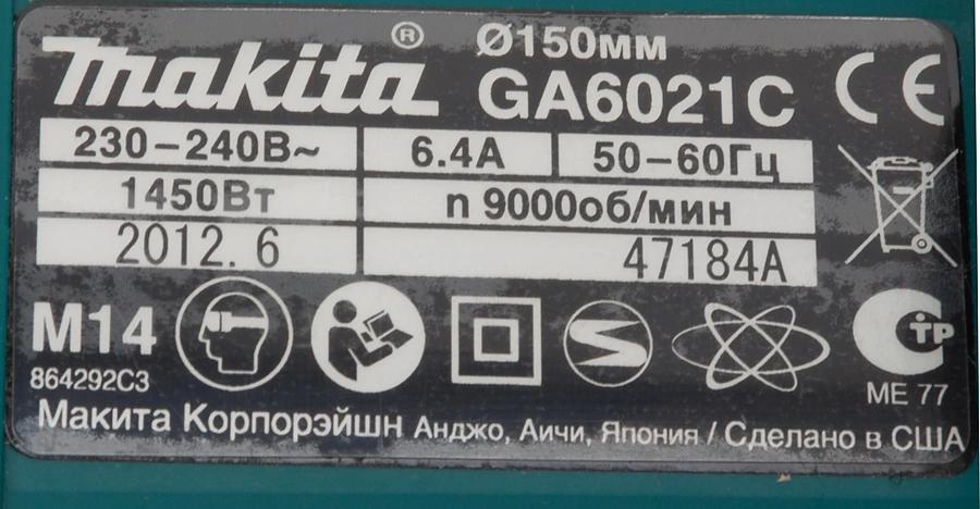 Углошлифовальная машина Makita GA6021C 1450Вт 9000об/мин рез.шпин.:M14 d=150мм