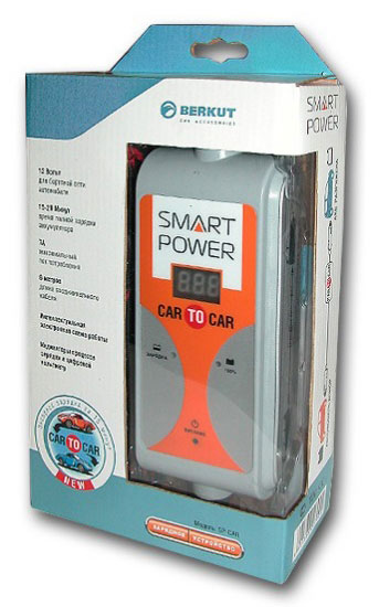 Зарядное устройство с двумя штекерами для прикуривателя. Первый штекер подключается к прикуривателю автомобиля-донора, второй штекер в прикуриватель автомобиля с разряженным аккумулятором. На корпусе имеются индикаторы заряда.