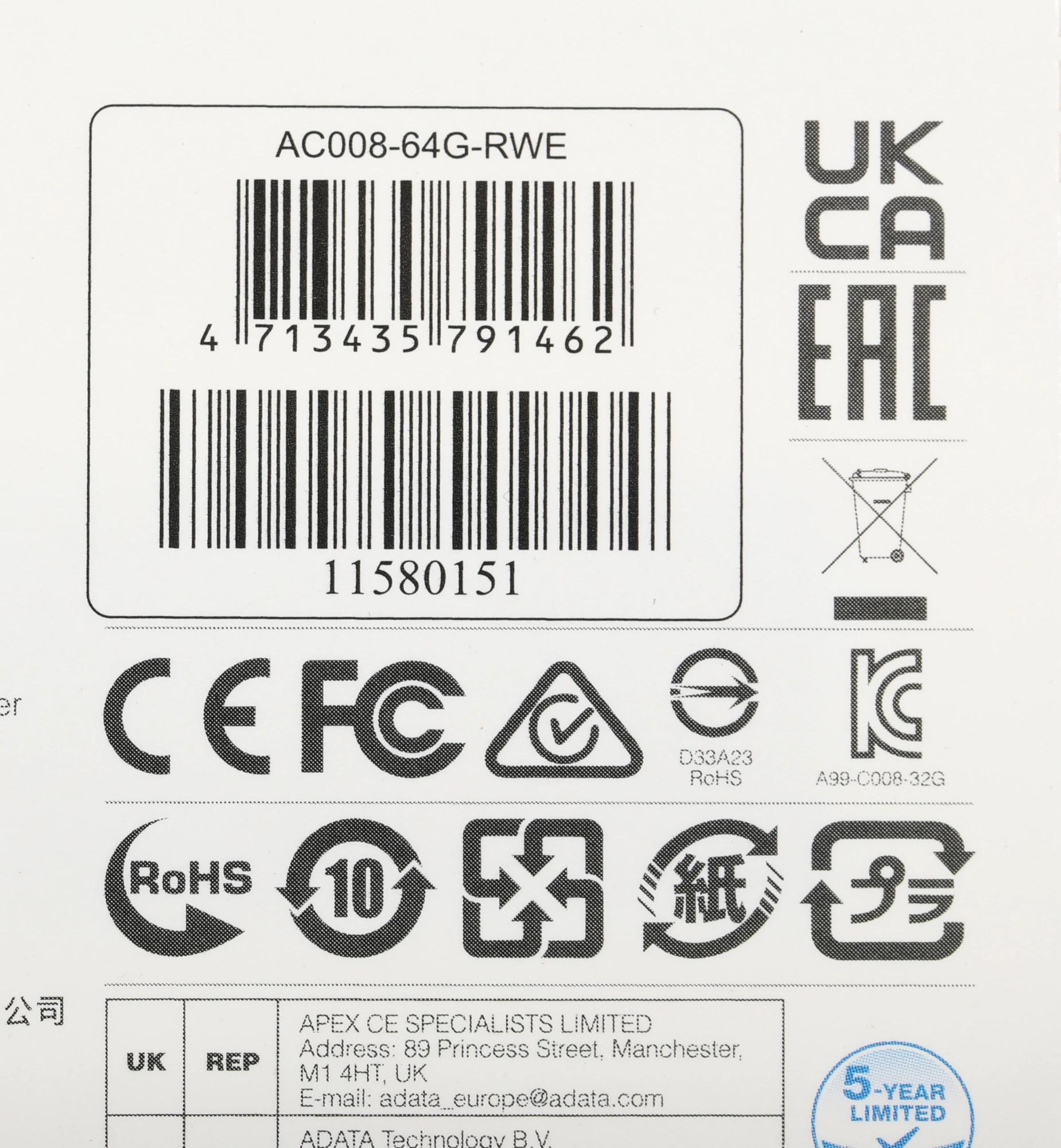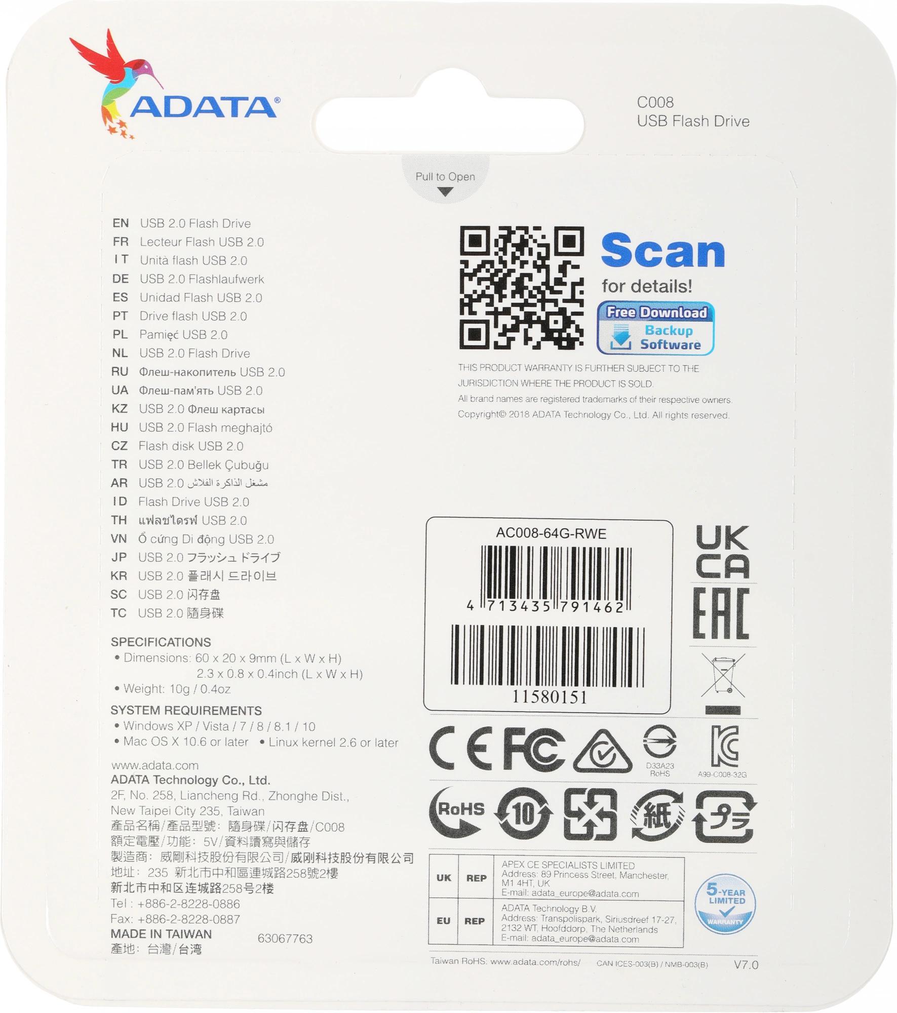 Флеш Диск A-Data 64GB Classic C008 AC008-64G-RWE USB2.0 синий/белый