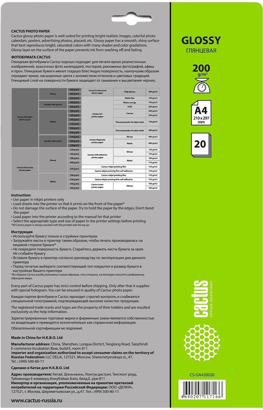 Фотобумага Cactus CS-GA420020 A4/200г/м2/20л./белый глянцевое для струйной печати