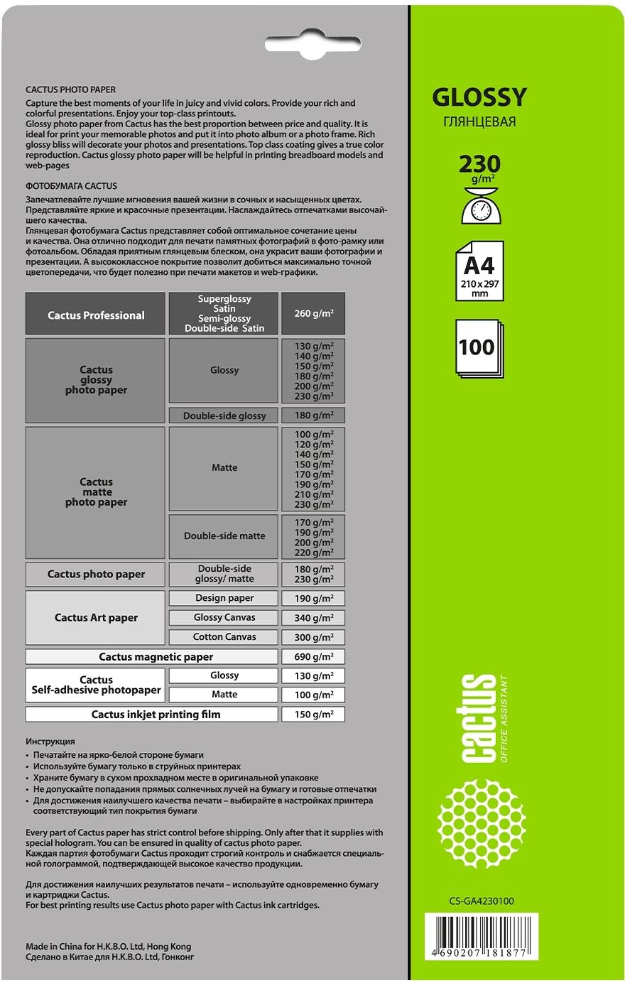 Фотобумага Cactus CS-GA4230100 A4/230г/м2/100л./белый глянцевое для струйной печати