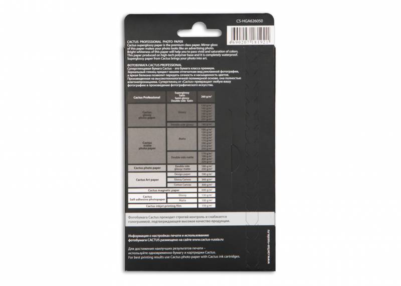 Фотобумага Cactus Prof CS-HGA626050 10x15/260г/м2/50л./белый глянцевое для струйной печати