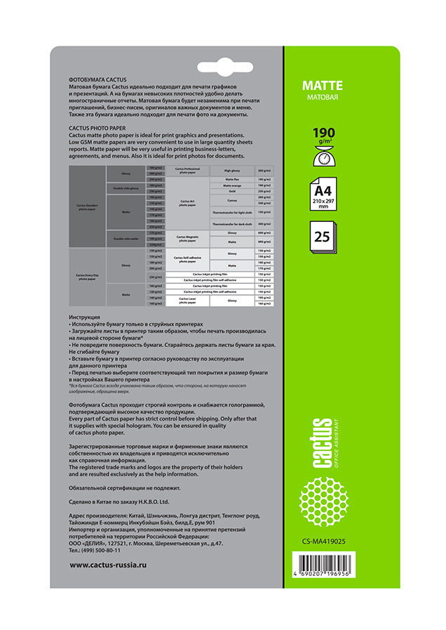 Фотобумага Cactus CS-MA419025 A4/190г/м2/25л./белый матовое для струйной печати