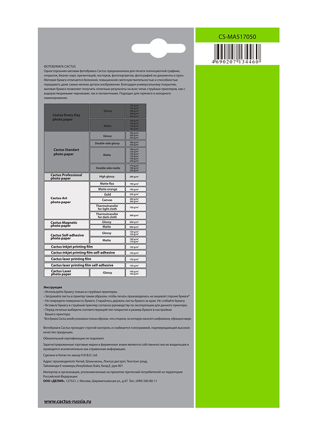 Фотобумага Cactus CS-MA517050 A5/170г/м2/50л./белый матовое для струйной печати