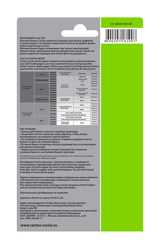 Фотобумага Cactus CS-MA6190100 10x15/190г/м2/белый/100л. матовое для струйной печати