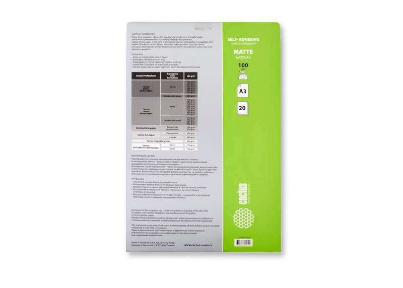 Фотобумага Cactus CS-MSA310020 A3/100г/м2/20л./белый матовое самоклей. для струйной печати