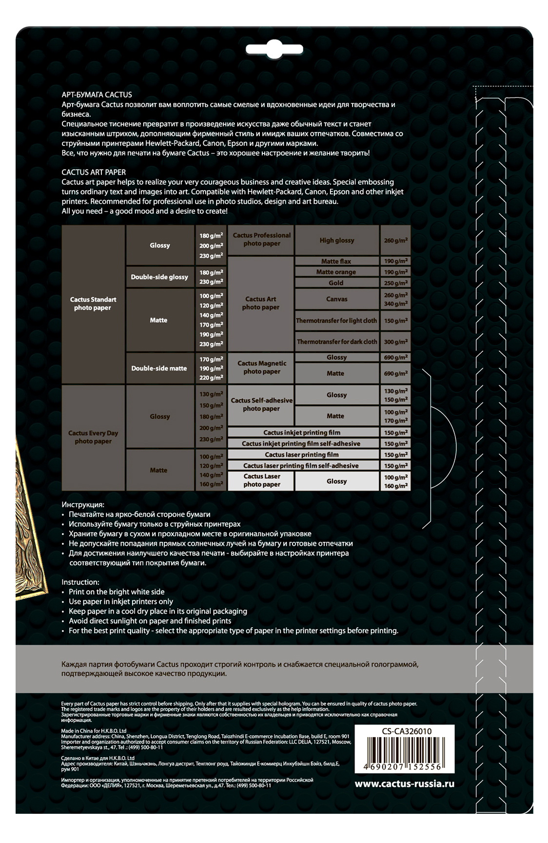 Холст Cactus CS-CA326010 A3/260г/м2/10л./белый хлопок для струйной печати