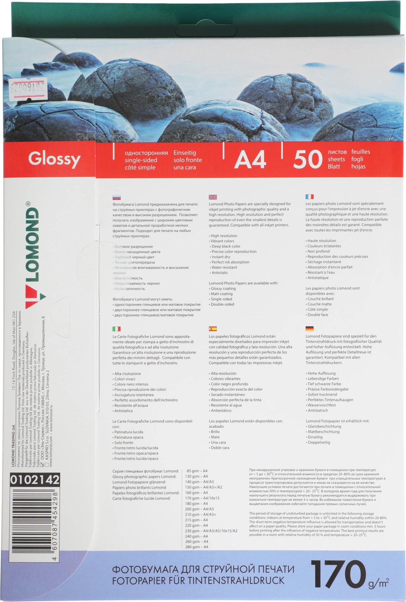 Фотобумага Lomond 0102142 A4/170г/м2/50л./белый глянцевое для струйной печати