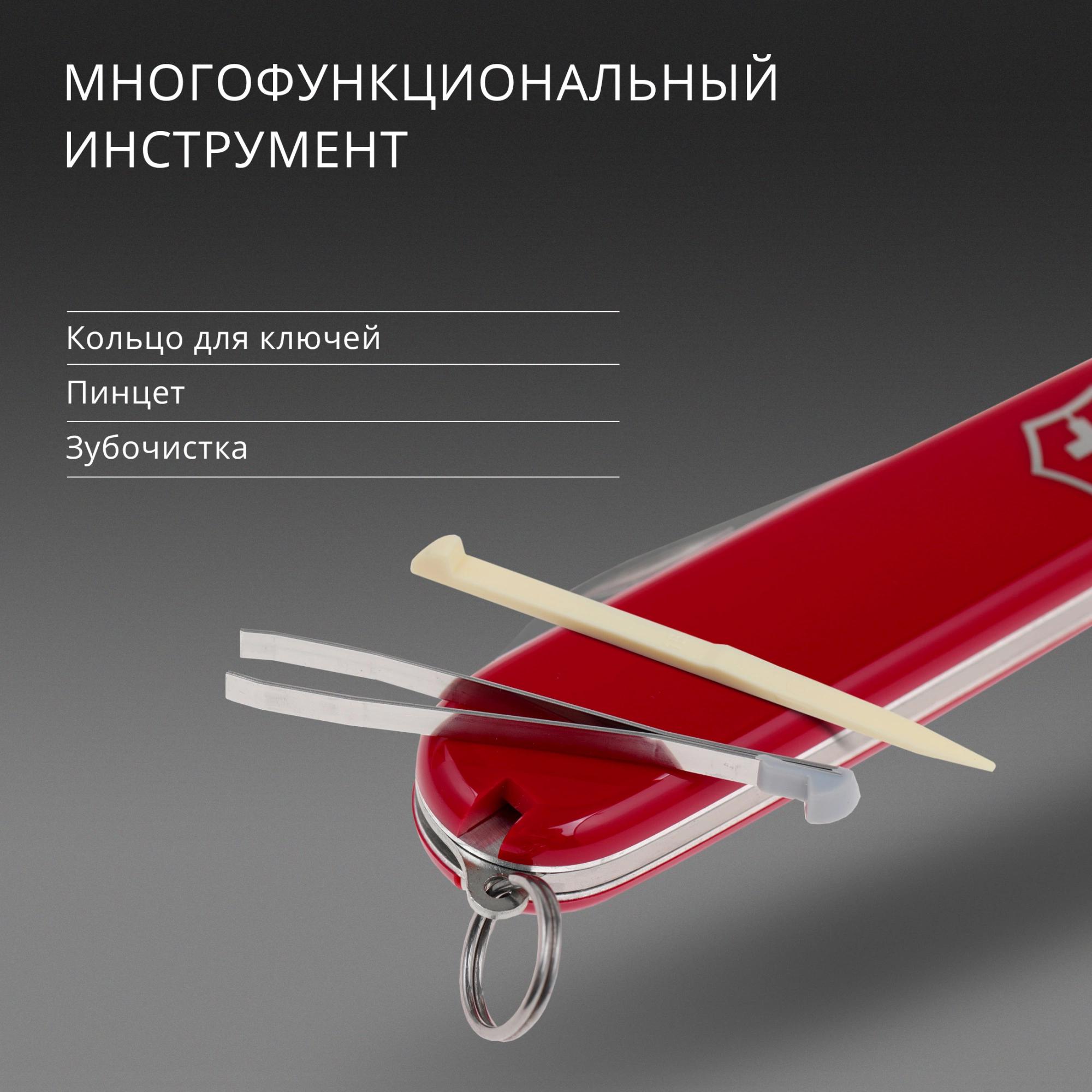 Нож, открывалка, консервный нож, отвертка, прибор для снятия изоляции, кольцо для ключей, пинцет, зубочистка.