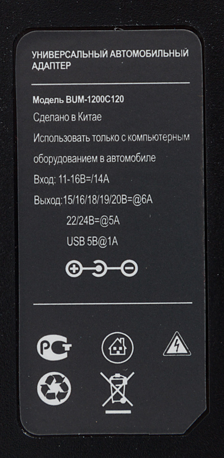 Универсальный автомобильный адаптер для ноутбуков мощностью 120 ватт и USB-портом для зарядки мобильных телефонов и планшетов. В комплекте входят 8 сменных штекеров, подходящих к большинству ноутбуков. Выбор мощности для питания происходит в ручном режиме.