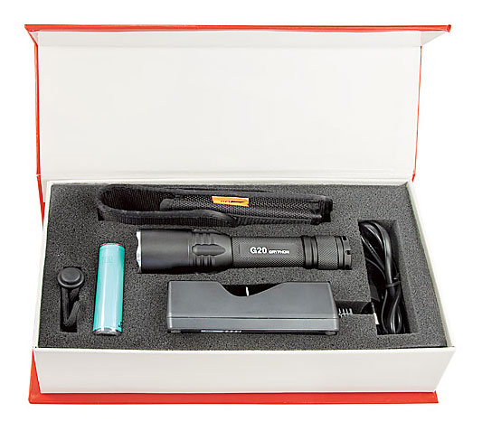 Фонарь, сетевое зарядное устройство ~100–240 В, литий-ионный аккумулятор Panasonic 18650 (с защитой) 3.7 В, 3100 мАч, ремешок на запястье, чехол для ношения на поясе.
