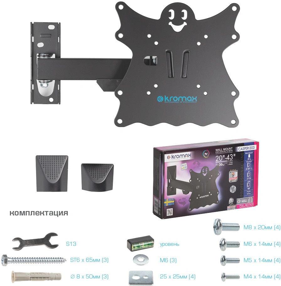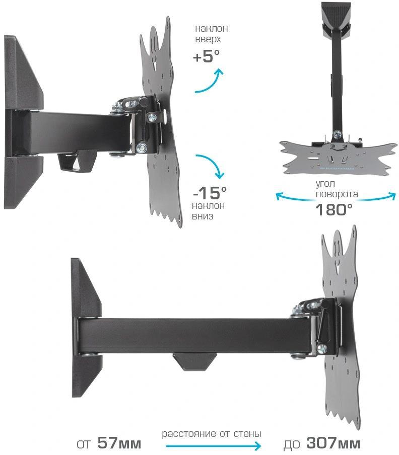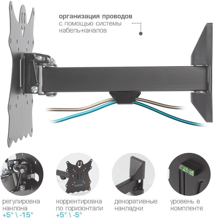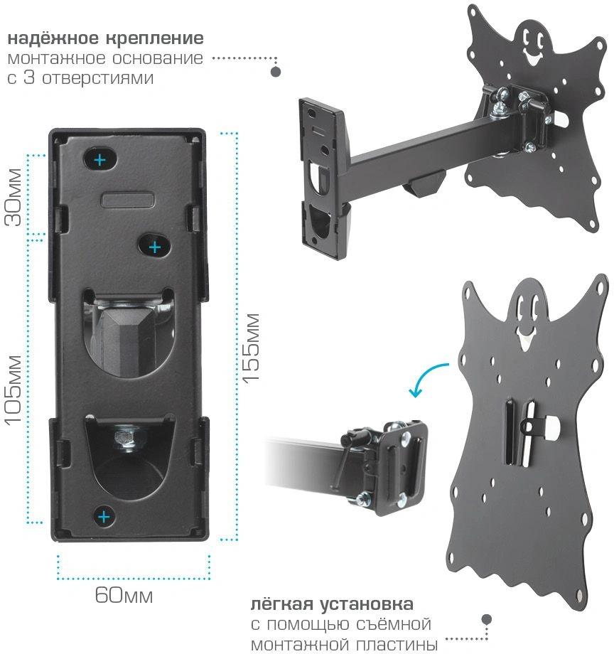 Наклонно-поворотный кронштейн для крепления к стене телевизоров и мониторов с не большой и средней диагональю экрана. Высококачественная стальная конструкция обеспечит надежное и безопасное использование. Легко снимающаяся монтажная пластина облегчит процесс уборки.