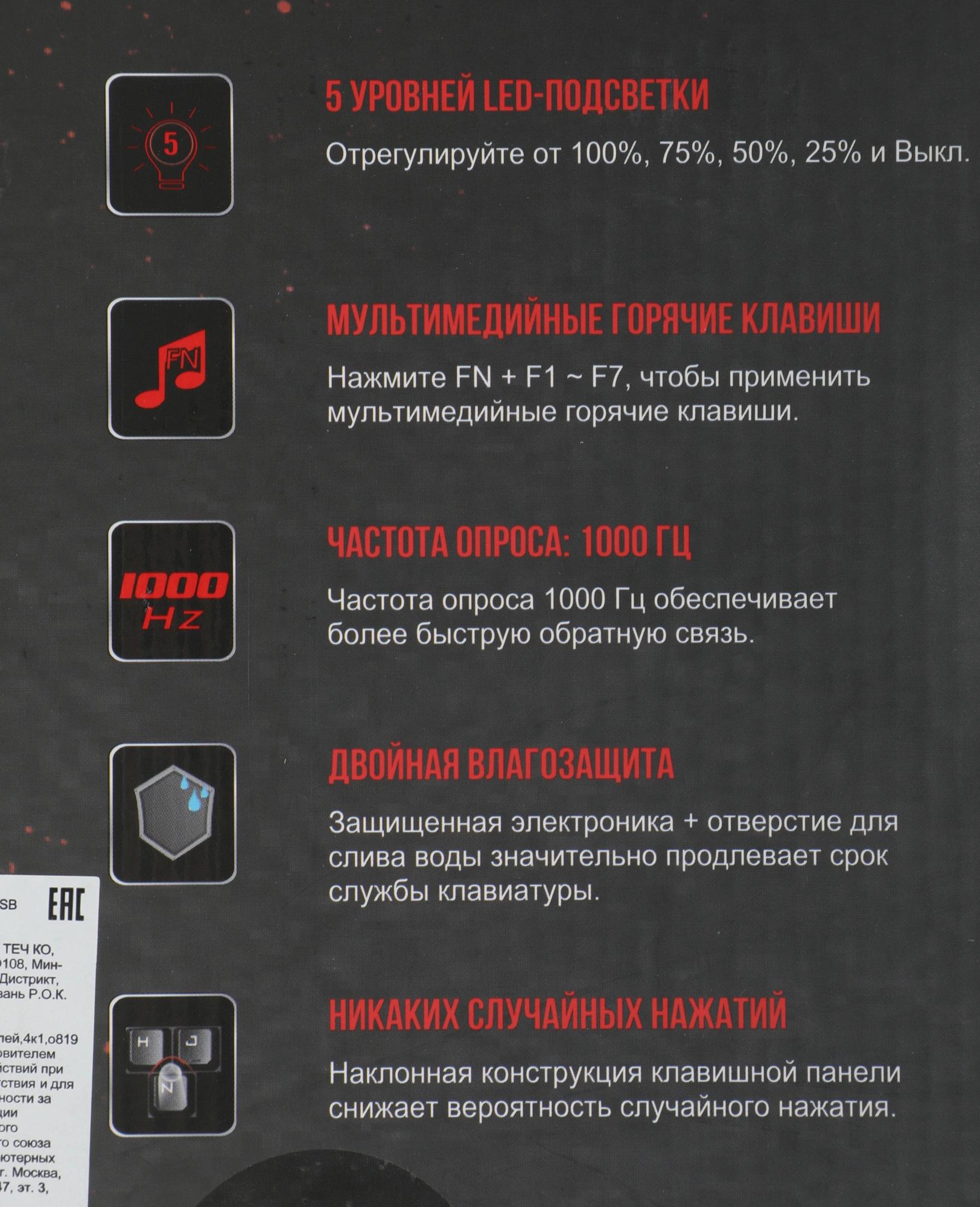 тип клавиш – мембранные, 4 силиконовых игровых клавиш, время отклика – 1 мс.