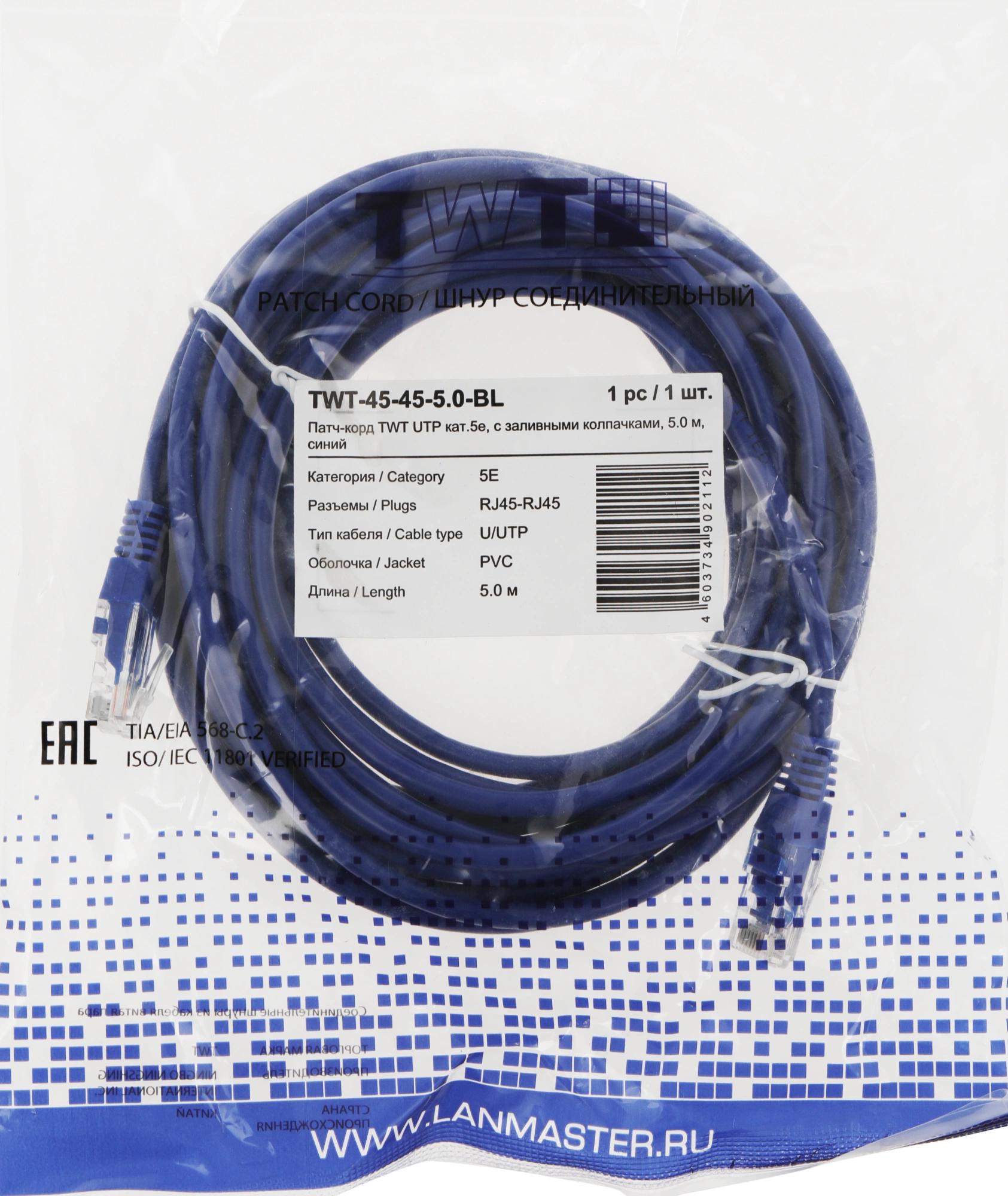Патч-корд Lanmaster TWT-45-45-5.0-BL UTP RJ-45 вил.-вилка RJ-45 кат.5E 5м синий ПВХ (уп.:1шт)