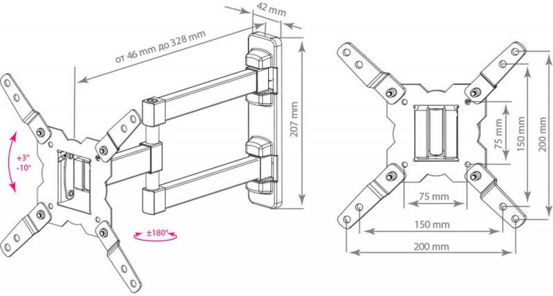 Надежная стальная конструкция максимальная нагрузка до 25 кг. Съемная монтажная пластина. Универсальная система крепления для любого типа проектора с посадочными отверстиями от 75 мм до 200 мм. Легкая регулировка. Декоративные настенные накладки.