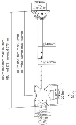 Потолочный кронштейн для LCD/LED телевизоров размером от 15 до 48 дюймов с максимальным весом до 55 кг. с возможностью крепления на наклонный потолок. Надежная стальная конструкция. Регулировка наклона 0-25 и углом поворота ±180 градусов. Максимальные крепежные размеры 200х200 мм.
