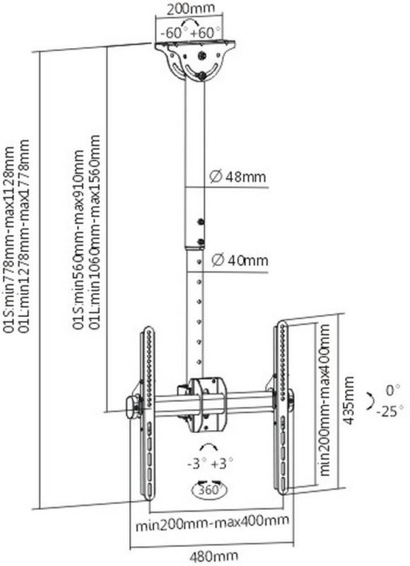 Потолочный кронштейн для LCD/LED телевизоров размером от 26 до 65 дюймов с максимальным весом до 50 кг. с возможностью крепления на наклонный потолок. Надежная стальная конструкция. Регулировка наклона 0-25 и углом поворота ±180 градусов. Максимальные крепежные размеры 400х400 мм.