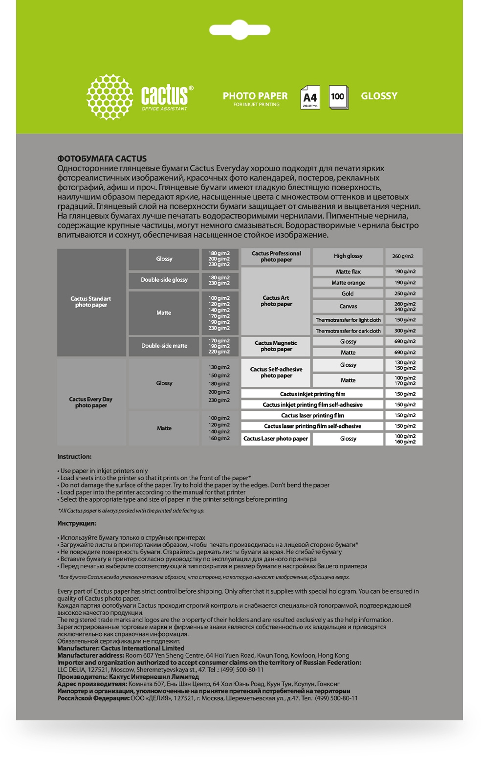 Фотобумага Cactus CS-GA4130100ED A4/130г/м2/100л./белый глянцевое для струйной печати