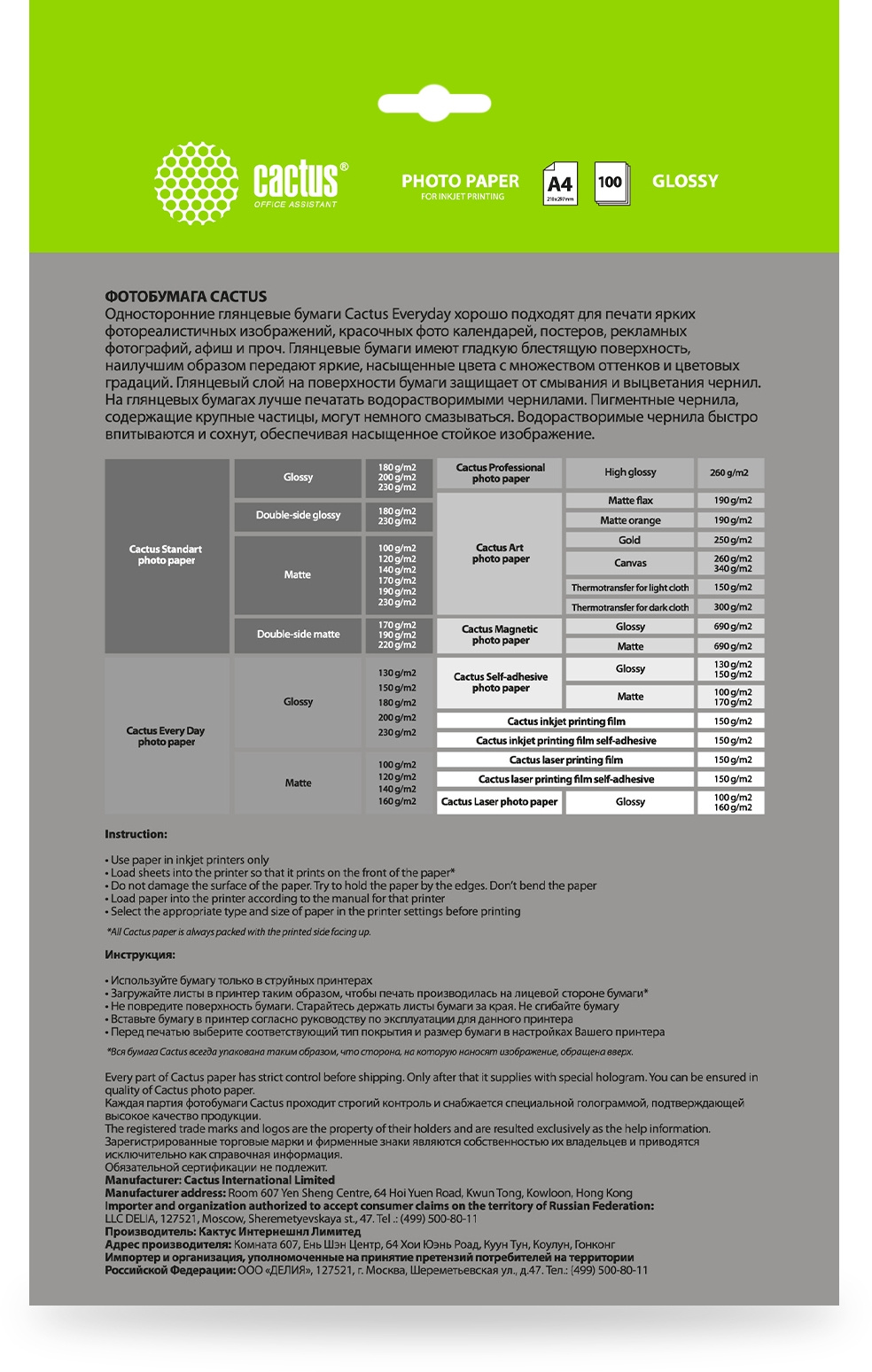 Фотобумага Cactus CS-GA4180100ED A4/180г/м2/100л./белый глянцевое для струйной печати