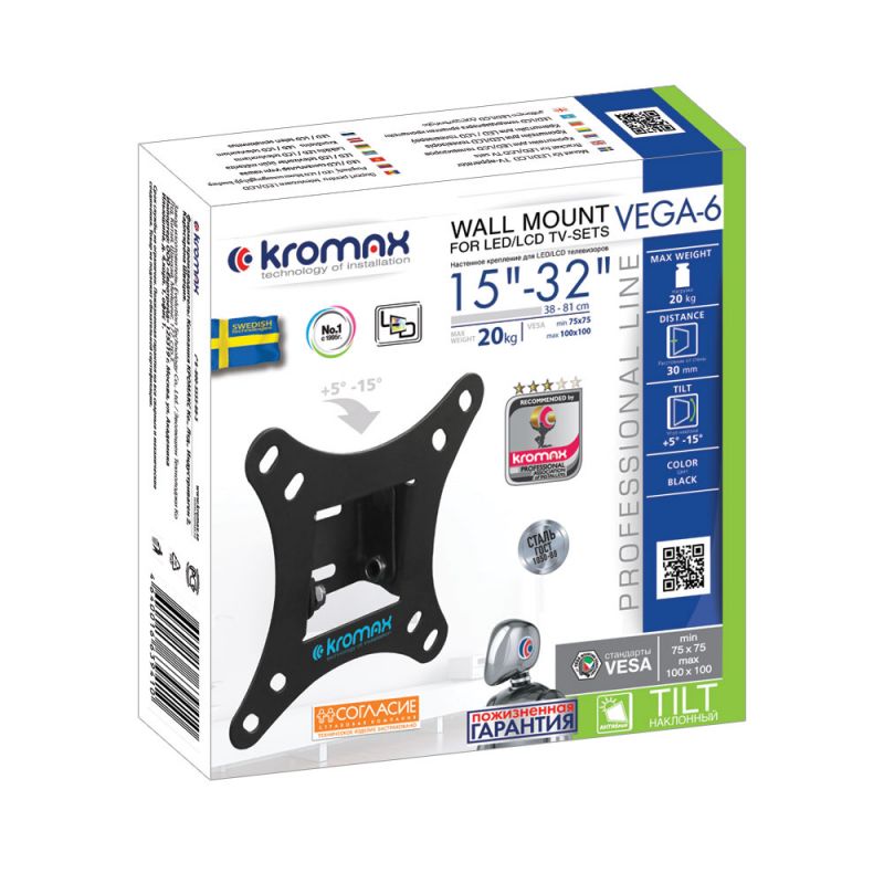 Кронштейн для телевизора Kromax VEGA-6 new черный 15"-32" макс.20кг настенный наклон