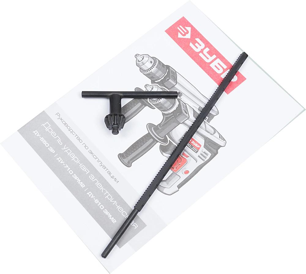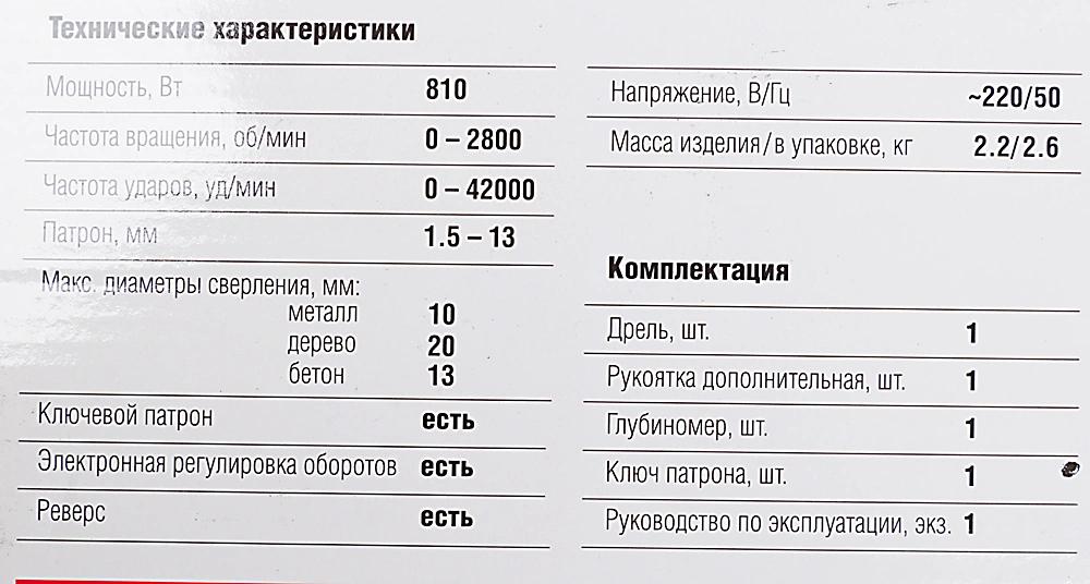 Дрель; дополнительная рукоятка; глубиномер; ключ патрона; руководство по эксплуатации; инструкция по безопасности; упаковка.