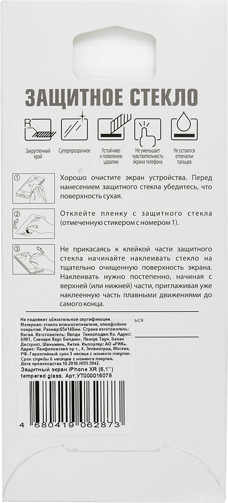 Защитное стекло для Apple iPhone XR, защищающее экран от царапин, потертостей, ударов при падении, а также от грязи и отпечатков пальцев. Толщина стекла всего в 0, 33 мм, сделает его почти незаметным, но при этом сохраняться полная чувствительность и цветопередача дисплея. Твердость 9H.