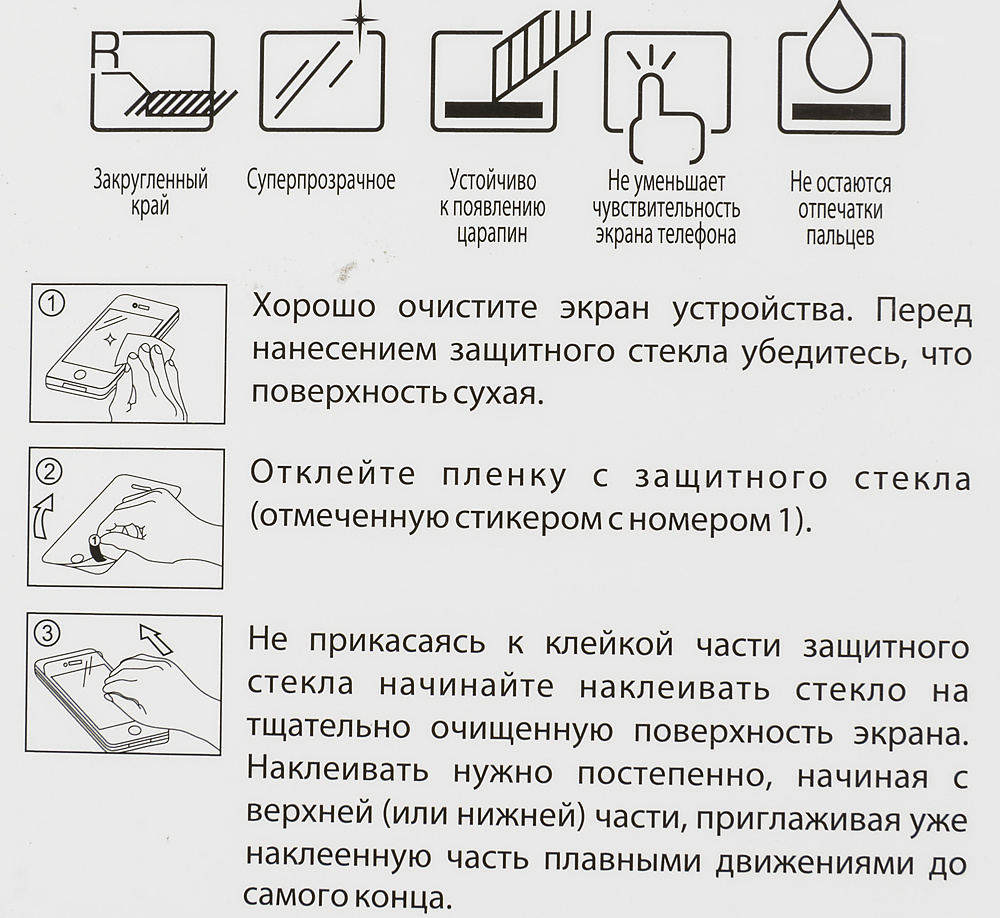 В комплект поставки входит: Защитное стекло, Влажная салфетка, Салфетка из микрофибры, Стикеры для удаления пыли с экрана, Стикеры для фиксации стекла на экране смартфона.
