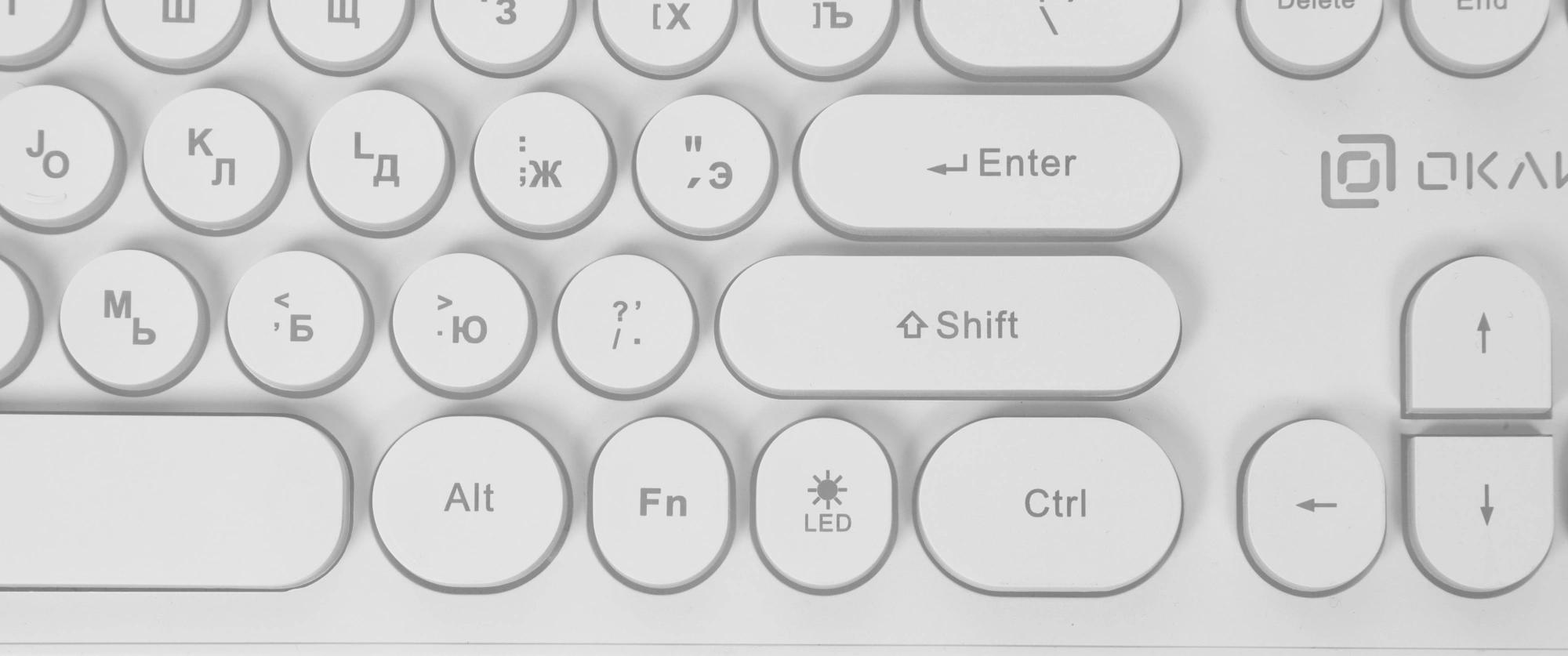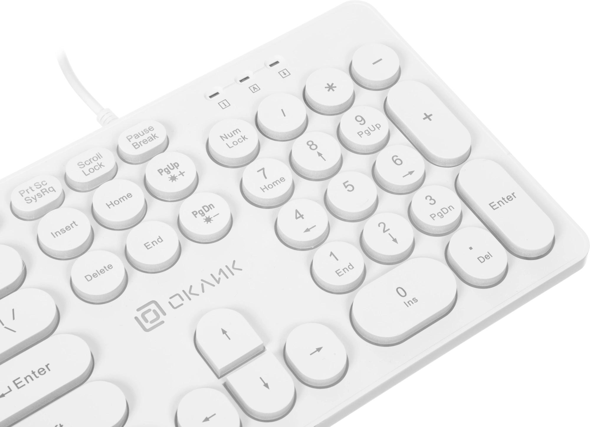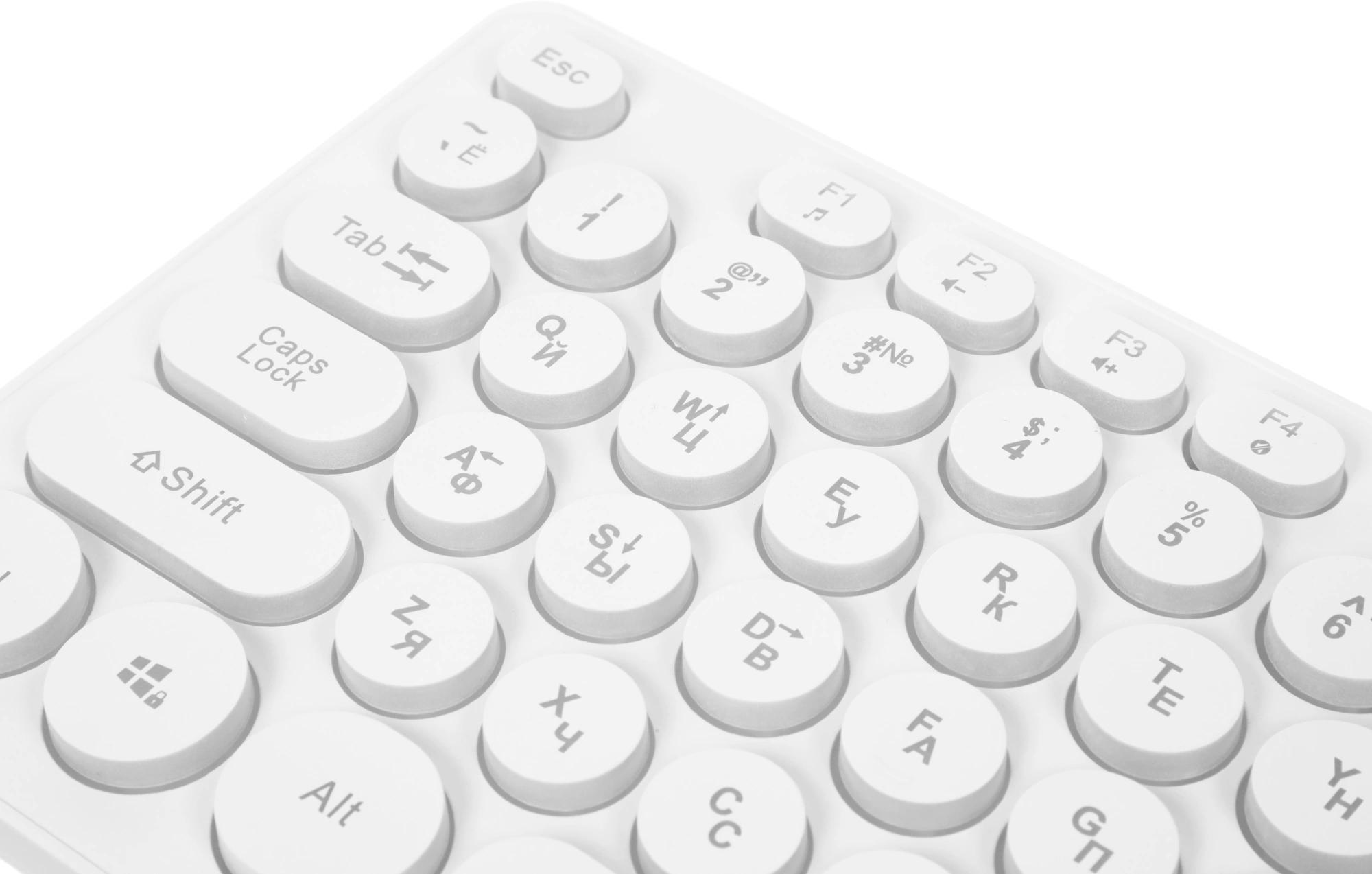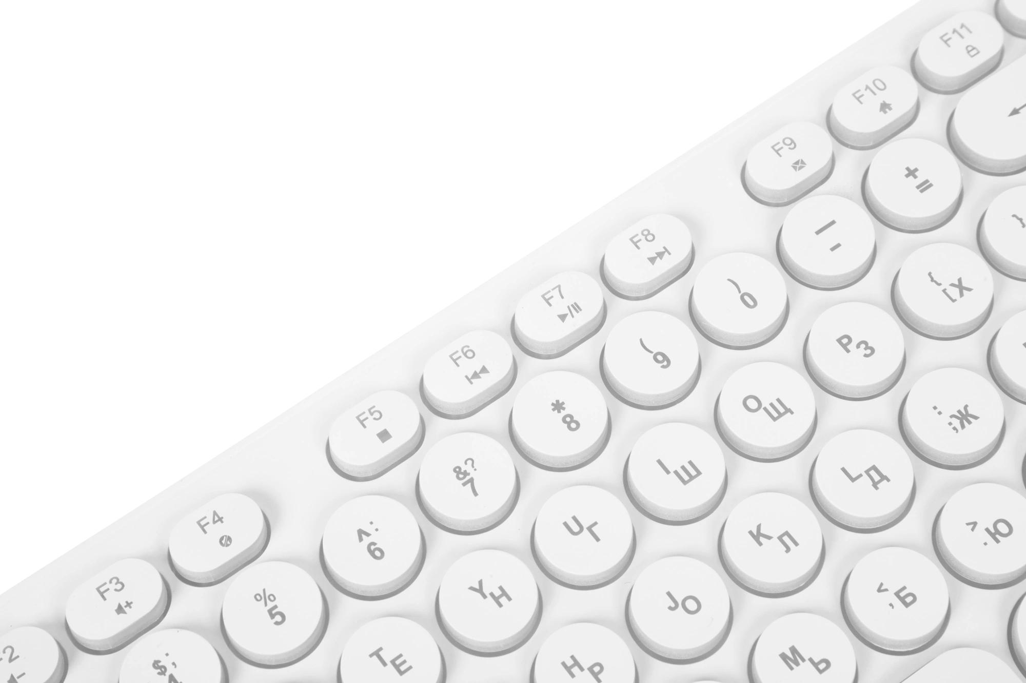 Тонкая клавиатура белого цвета с круглыми клавишами островного типа с, мультимедийный функционалом, регулируемая подсветка, блокировка клавиши Пуск