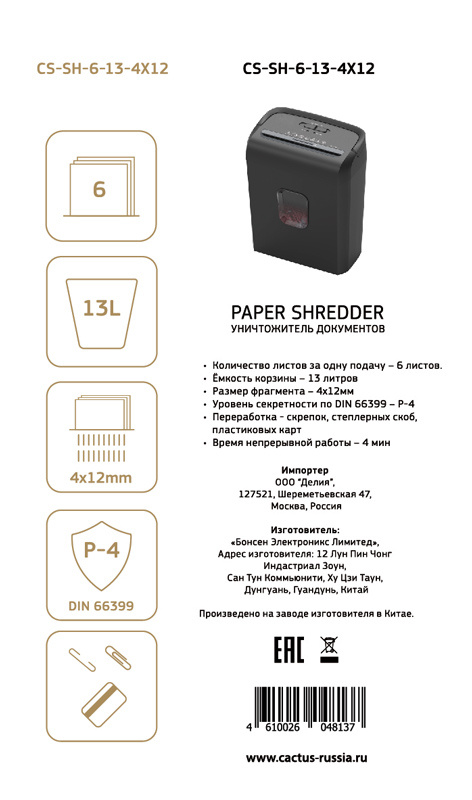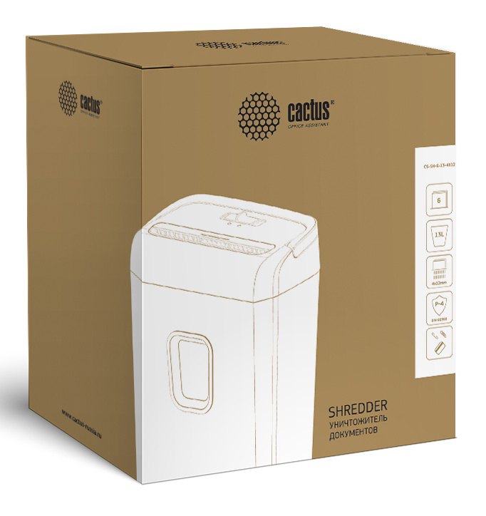 Шредер Cactus CS-SH-6-13-4X12 (секр.P-4) фрагменты 6лист. 13лтр. скрепки скобы пл.карты