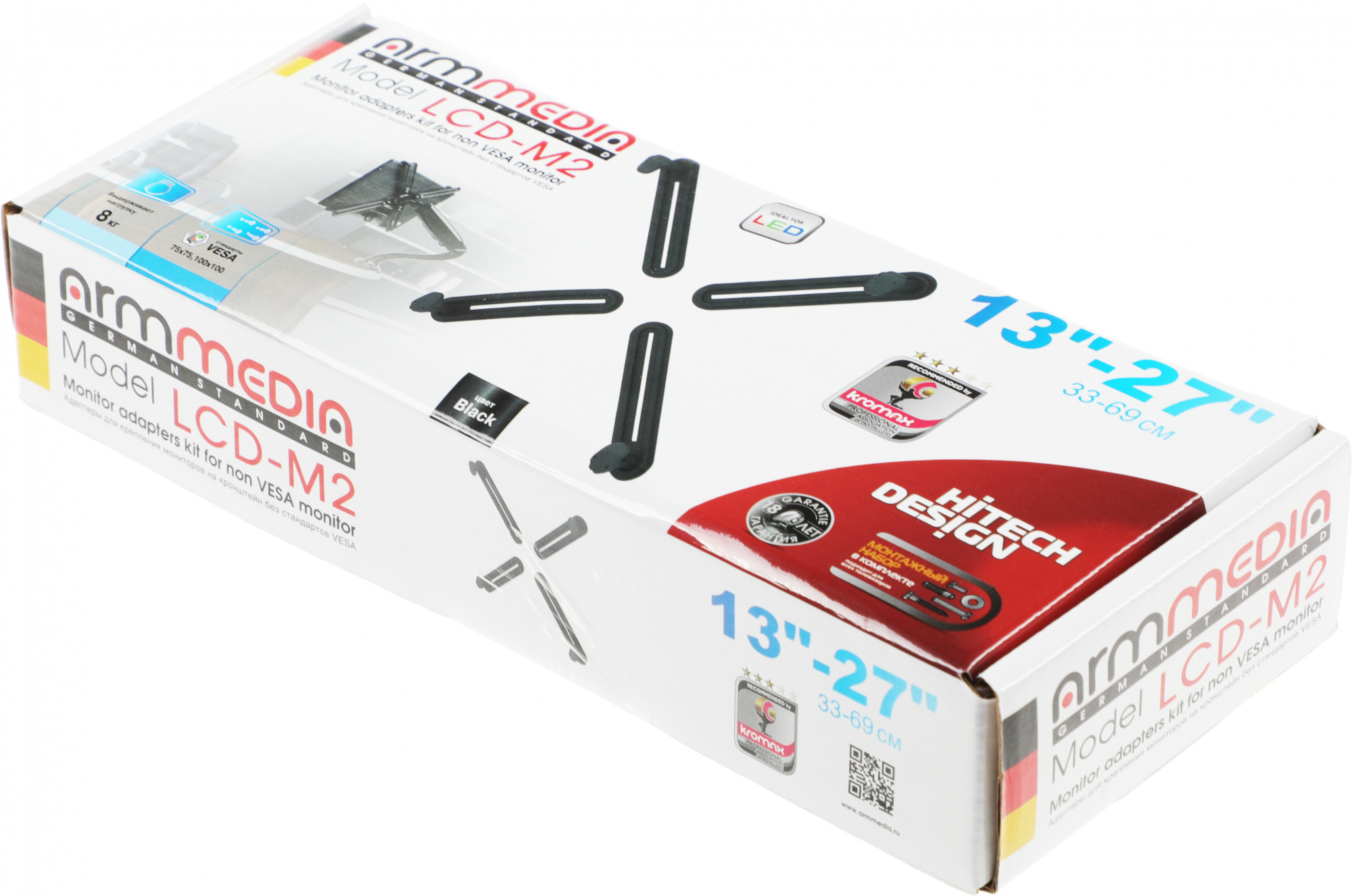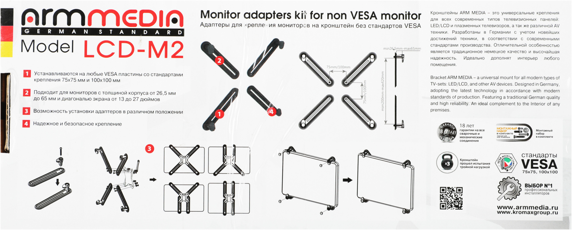 Комплект адаптеров для крепления мониторов на кронштейн без стандартов VESA Устанавливаются на любые VESA пластины со стандартами крепления 75х75 мм и 100х100 мм. Подходит для мониторов с толщиной корпуса от 26, 5 мм до 65 мм и диагональю экрана от 13 до 27 дюймов