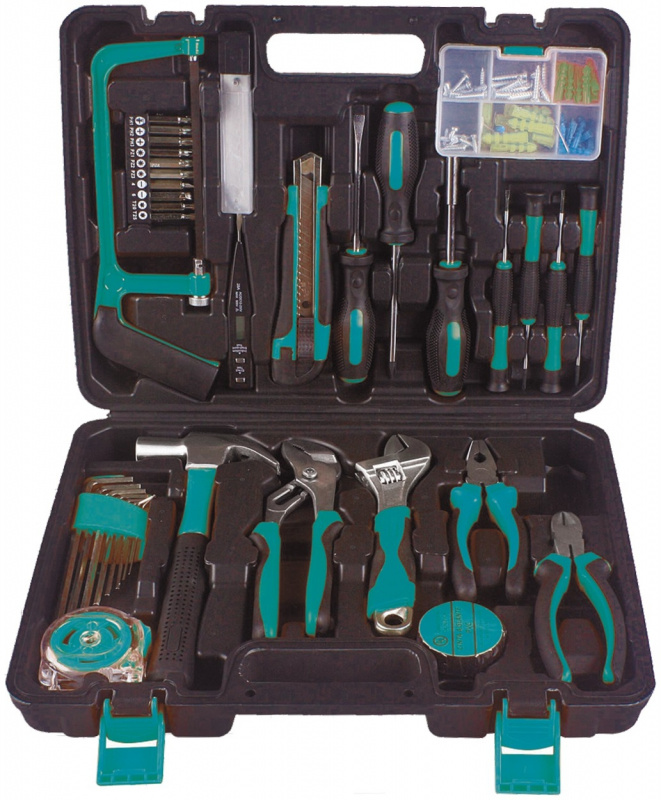 Ножовка по металлу (1 шт)Биты (10 шт)Лезвие для ножа (5 шт)Тестер (1 шт)Нож (1 шт)Отвертка (7 шт)Ключ имбусовый (8 шт)Молоток (1 шт)Ключ трубный (1 шт)Ключ разводной (1 шт)Плоскогубцы (1 шт)Бокорезы (1 шт)Изолента (1 шт)Набор насадок (60 шт)Рулетка (1 шт)