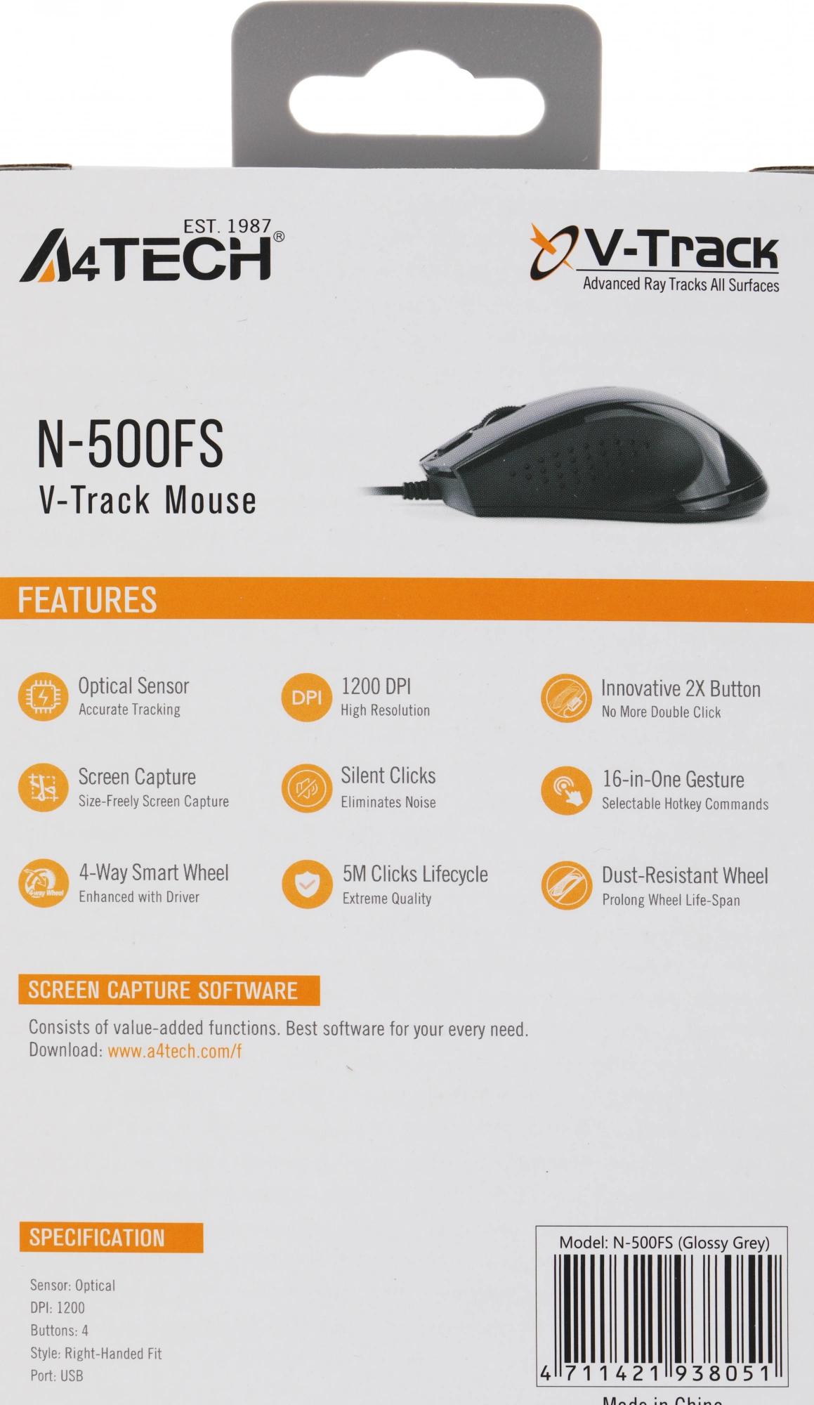 Мышь A4Tech V-Track Padless N-500FS черный оптическая 1200dpi silent USB 3but