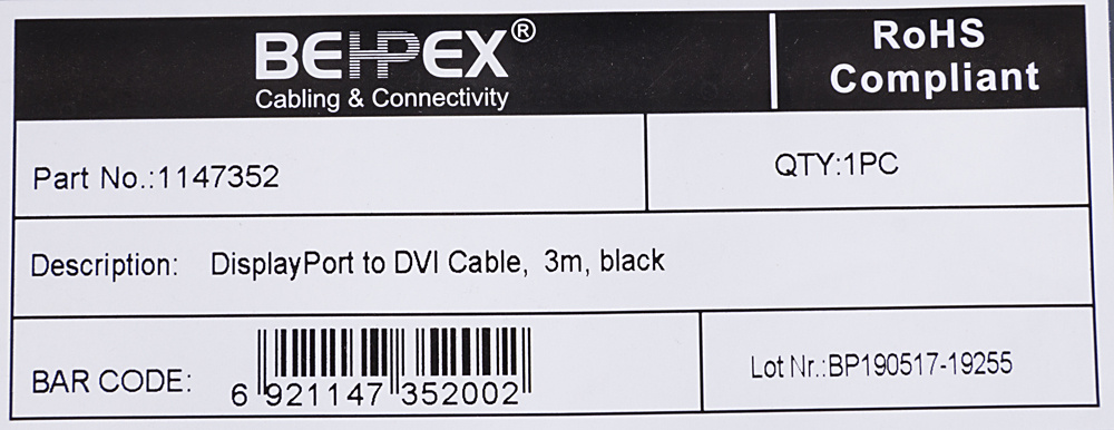 Кабель DisplayPort (m) DVI (m) 3м черный