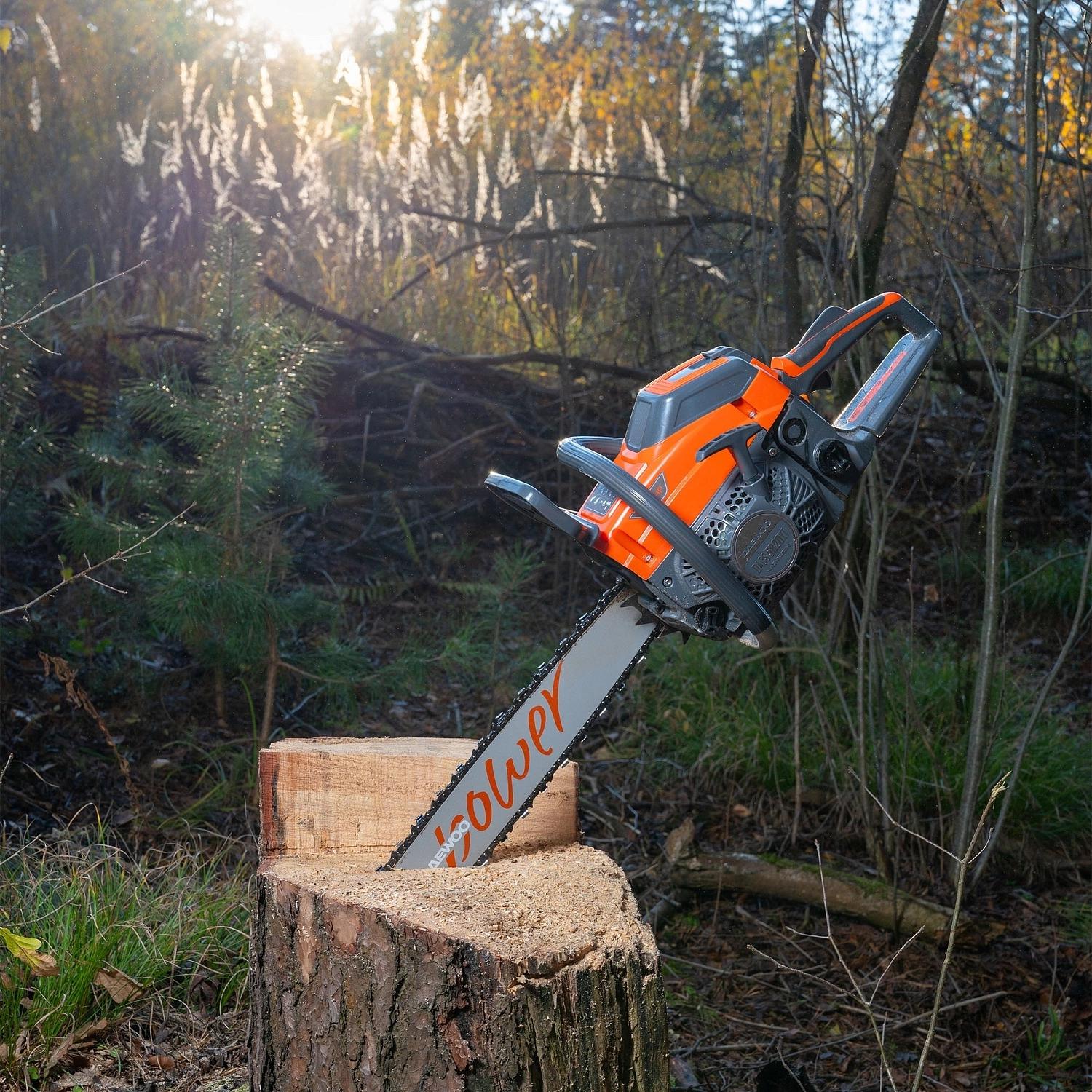 Магнезиевый стартер с системой Easy Start; Поршневая группа с никасиловым покрытием; Электронное необслуживаемое зажигание C.D.I.; Моментальная остановка цепи; Антивибрационная система Daewoo; Бесключевой доступ к воздушному фильтру; Эргономичная рукоятка включения; Металлический зубчатый упор