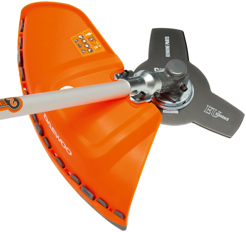 Эргономичный рычаг управления двигателем; Трехлопастной нож; Защитный кожух из ударопрочного ABS-пластика; Разъемный алюминиевый вал; Оптимальная балансировка; Система гашения шума и вибрации; 3-х летняя гарантия Daewoo